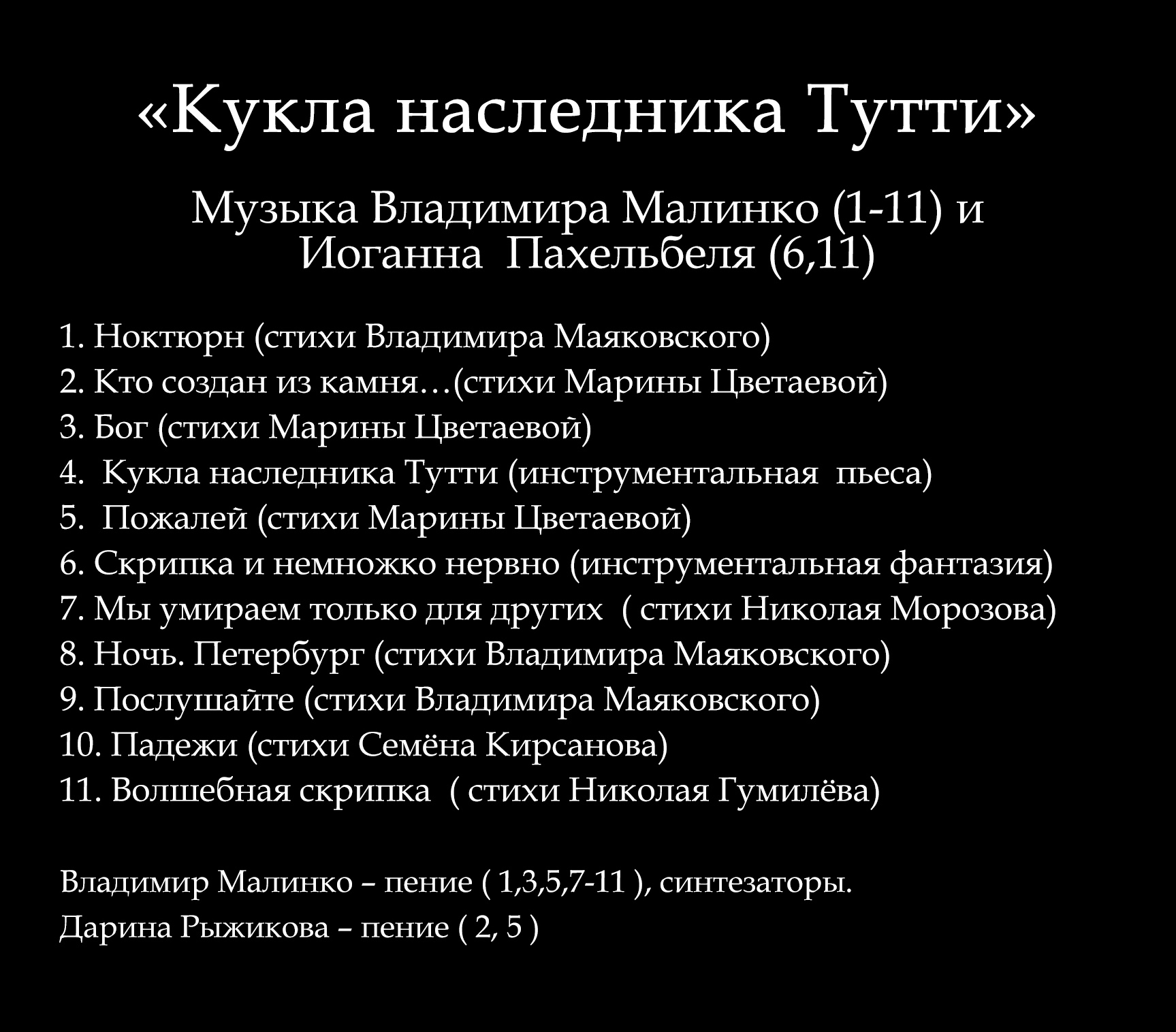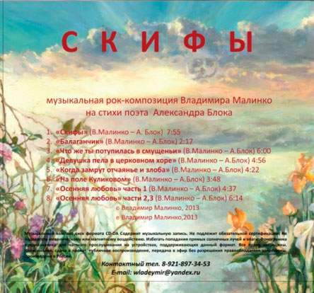 музыкальная рок-композиция Владимира Малинко на стихи поэта Александра Блока. Владимир Малинко – синтезаторы, вокал, аранжировки, запись и оформление альбома. В записи альбома принимала участие Дарина Рыжикова – вокал (2,4), бэк-вокал (6).